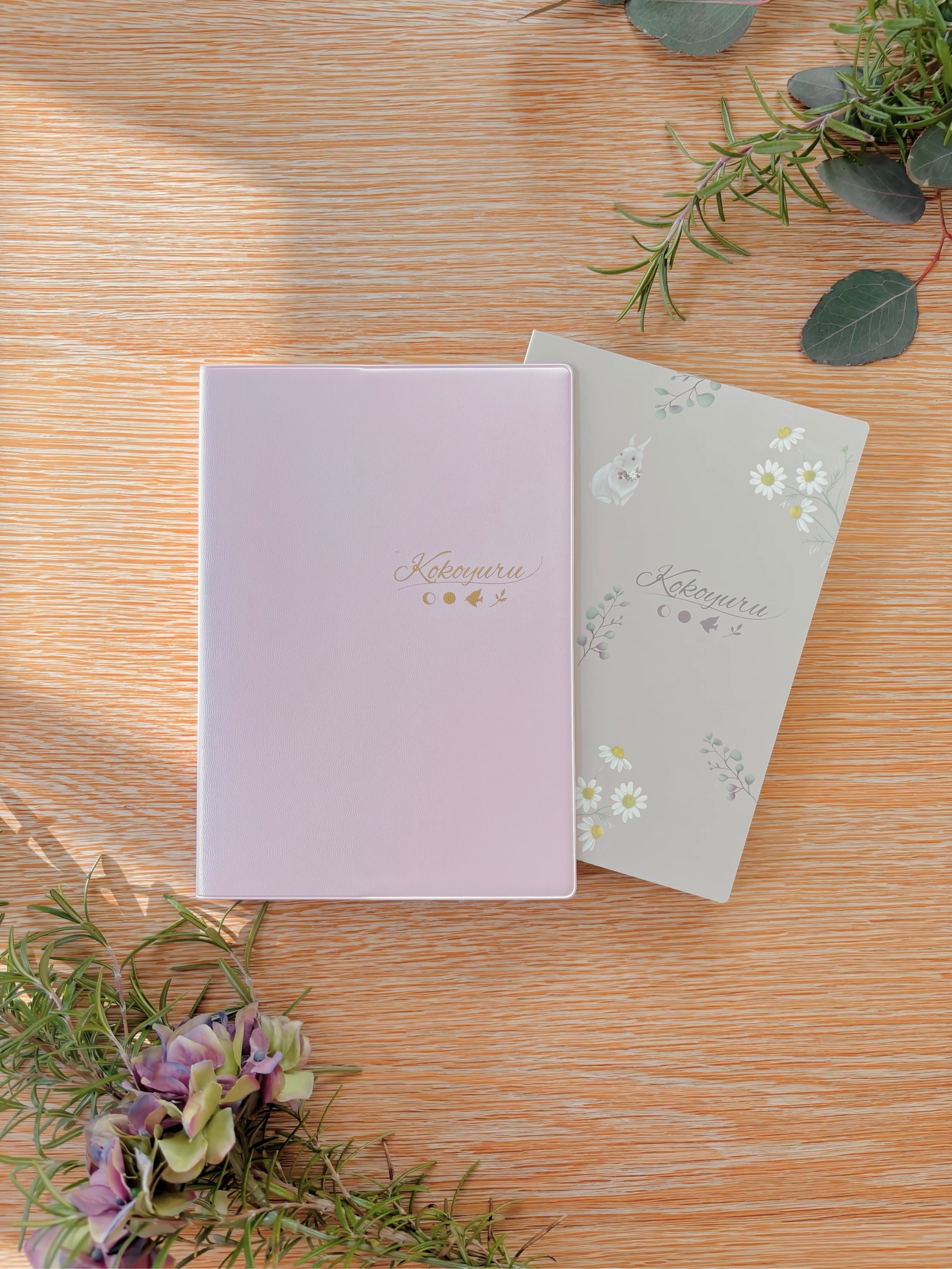 新しいここゆる手帳の表紙は誰でも馴染むシンプルで高級感のあるビニールカバー+かわいらしい大人なイラストデザインの薄型マンスリー付き。ロゴは箔押しが施されています。月の満ち欠け、恵みある植物、生命、そんなイメージを込めています。